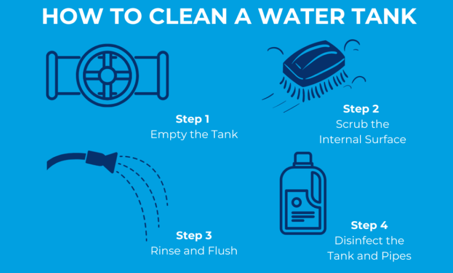 - Water tanks should be cleaned and disinfected annually (or more frequently if an